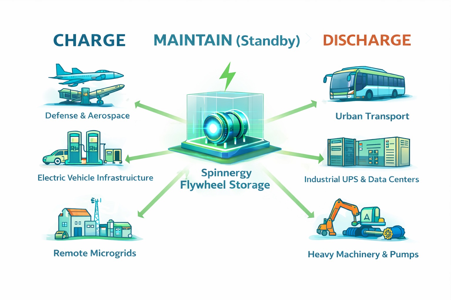 Spinnergy’s system is built around a high-speed motor-generator coupled with a precision-balanced rotating mass that stores energy kinetically. Engineered using advanced materials and intelligent control systems, it delivers exceptional performance under demanding, high-power applications. The architecture is designed to ensure rapid response, long operating life, and minimal maintenance, all within a compact, modular platform scalable from auxiliary use cases to full-scale deployment.